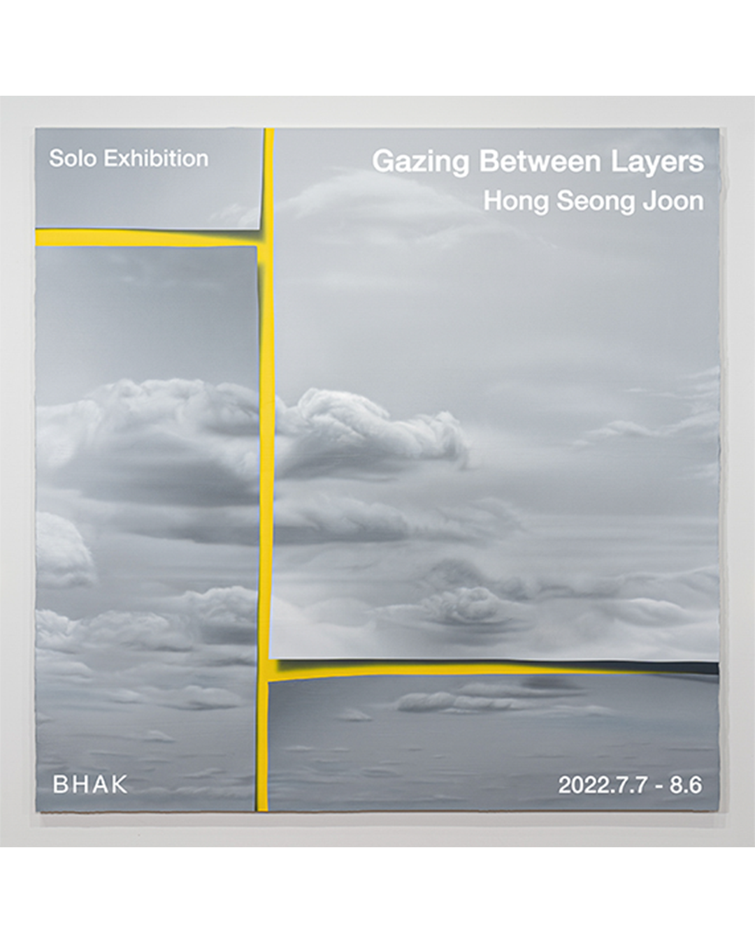 저 멀리 있어야 하는 하늘이 눈 바로 앞에 다가와 있다. 캔버스의 크기에 따라 점차 밝아지는 하늘, 쌓여진 종이에 그려진 맑고 청량한 하늘, 여러 면으로 흩어져 조각나 있는 하늘은 모두 《레이어 사이를 바라보다 Gazing Between Layers》에서 선보이는 홍성준 작가의 신작들이다. 본 전시의 작품들은 홍성준이 천착해 온 레이어(Layer, 겹) 형식의 자연 풍경이 회화의 형식적 근원을 이야기하는 작업부터, 축적된 레이어 덩어리와 겹쳐진 레이어 사이에서 감지할 수 있는 시간성에 대한 작가의 최근 관심사까지, 정교하게 드러낸다.